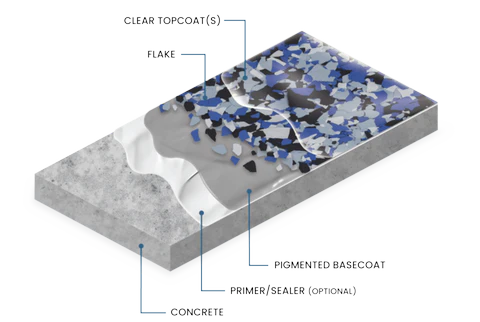 Personnalisez votre plancher époxy grâce à nos combinaisons de couleurs et flocons haut de gamme.